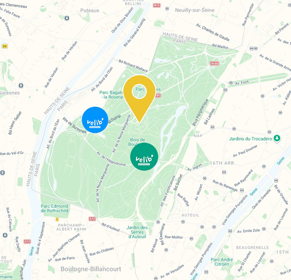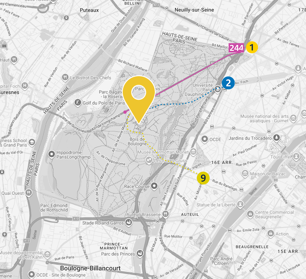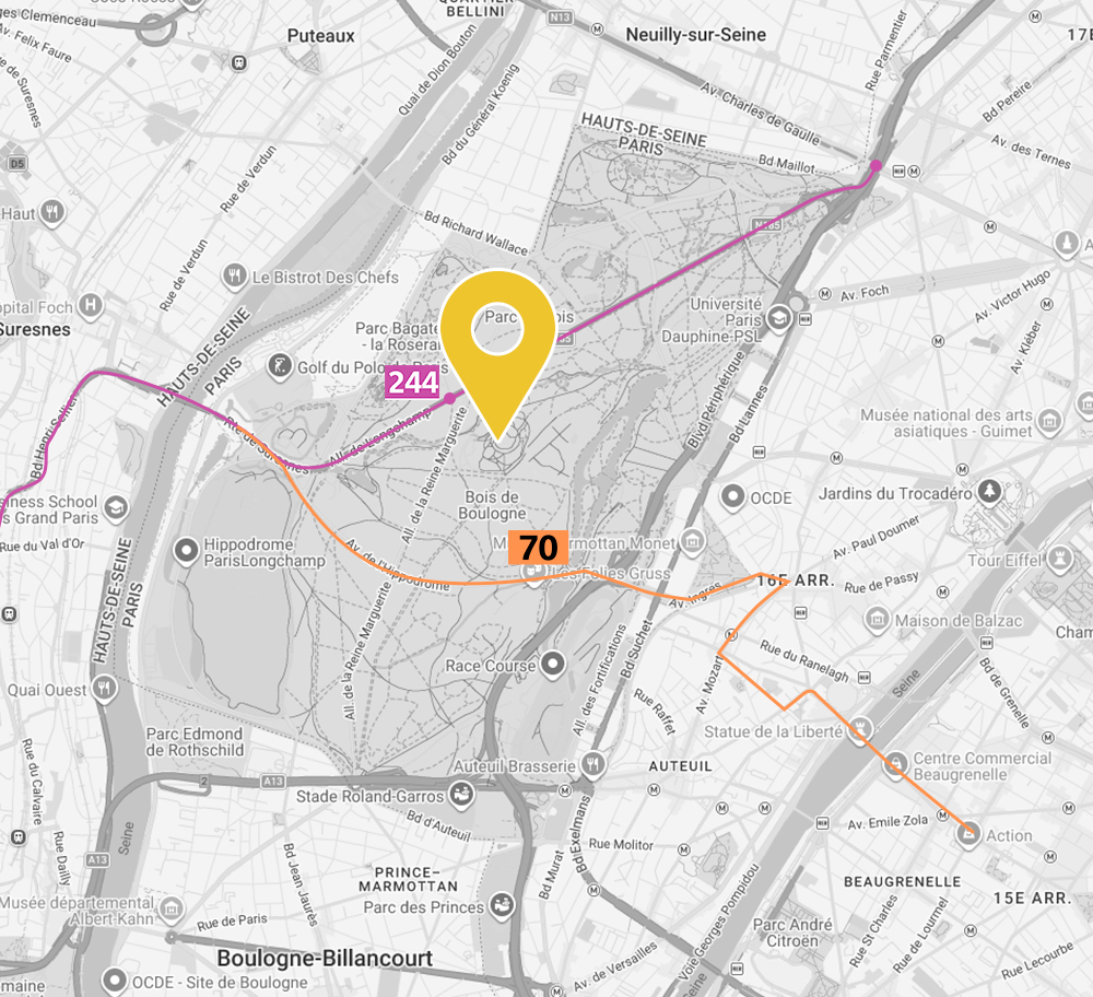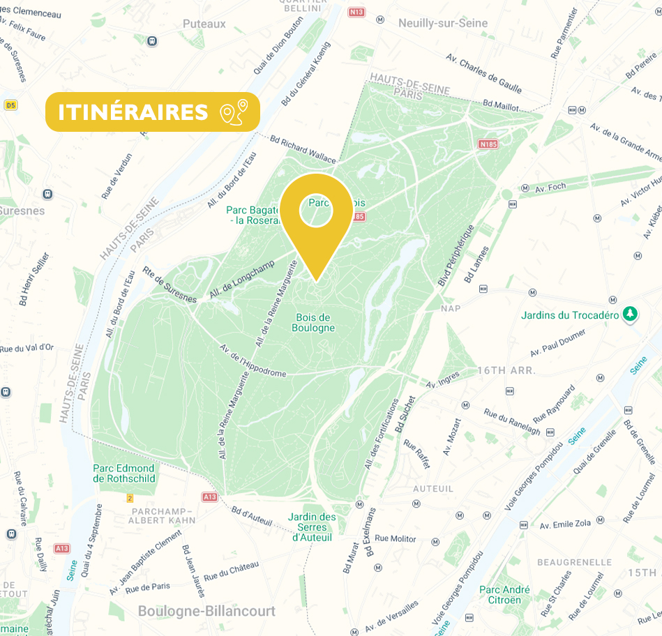 Descendre ensuite à l’arrêt « Bagatelle-Pré Catelan » puis 5 minutes de marche à travers le bois.